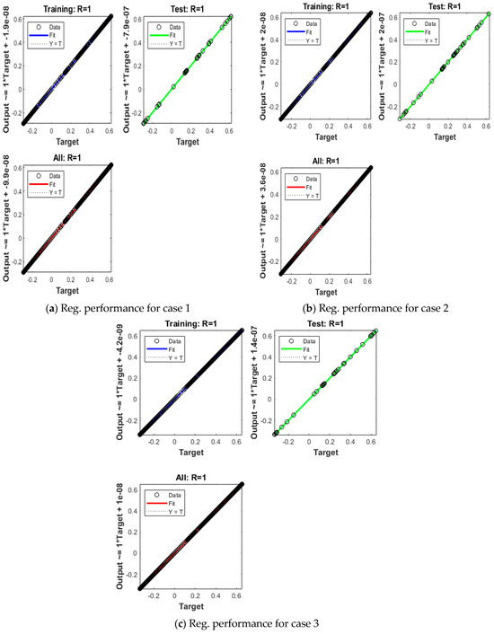 The current section provides three different cases by fixing these values , , and , while the values of are taken as 0.6, 0.7 and 0.8. Figure 3, Figure 4, Figure 5, Figure 6 and Figure 7 display the numerical MFLMM based on the designed BRNNA. Figure 3, Figure 4 and Figure 5 present the MFLMM, which is developed using the computational BRNNA. The mean square error (MSE) results achieved by employing the BRNNA to solve the MFLMM are presented in Figure 3. The optimal results are presented as 4.67150 × 10−11, 1.77309 × 10−11, and 2.65858 × 10−12 by using the epochs as 260, 359, and 871 for cases 1–3. By increasing the epochs, the testing, training, and endorsement curves perform the position of steady state using the performances up to 10−12. The gradient operator values for the first to the third case are presented as 5.1178 × 10−8, 1.4841 × 10−8, and 9.1037 × 10−9. An error gradient shows the magnitude and direction values that are performed during the process of training based on the proposed neural network, which is applied to enhance the weights of the network with the right amount and direction. Figure 4 shows the obtained calculated results along with the EHs measures to solve the MFLMM. The EHs for cases 1 to 3 of the MFLMM have been performed as 1.81 ×10−7, 1.97 × 10−6, and 6.45 × 10−7. Figure 4 shows a plot, based on justification, of the testing, and training that perform the best. It also shows the training that performs the momentum constant or parameter, which is contained in the updated weight expression to evade the local minimum issues. Figure 5 depicts the correlation graphs produced through the BRNNA for the MFLMM, which is one (perfect value) for each case. The coefficient of correlation (R) varies in input −1 and +1; however, if R performance is found to be +1, high performance of the network is obtained along with positive linear relationship. The precision of the designed BRNNA for the MFLMM is achieved in the form of test/train and verification. Table 1 performs the MSE by using the BRNNA for the MFLMM.