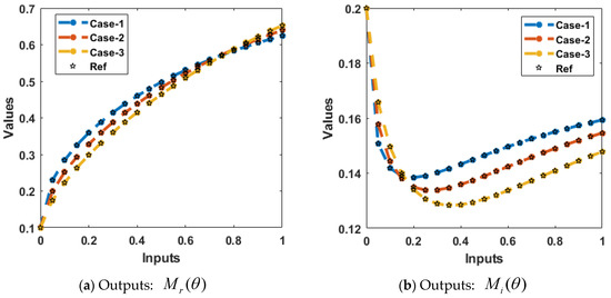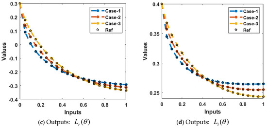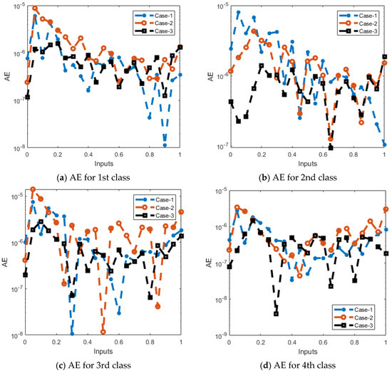 Figure 6 and Figure 7 present the comparisons and the AE performances for the MFLMM using the BRNNA. Figure 6 provides the graphs of result comparisons that have been obtained through the matching of proposed and reference results. These corresponding results provide the accuracy of the scheme for solving the MFLMM. Figure 7 indicates the AE performances for each dynamic of the MFLMM. AE performances for are illustrated in Figure 7a, and lie as 10−6–10−8, 10−5–10−7, and 10−6–10−7 for cases 1 to 3. For the class , the AE for cases 1 to 3 is performed as 10−5–10−6, 10−5–10−7, and 10−6–10−7. These measures for the classes and are derived in Figure 7c,d that are performed as 10−6–10−9, 10−6–10−8 and 10−7–10−8 for the first to the third case. These results match and are reduceable to AE, which implies the accuracy of the BRNNA for solving the MFLMM.