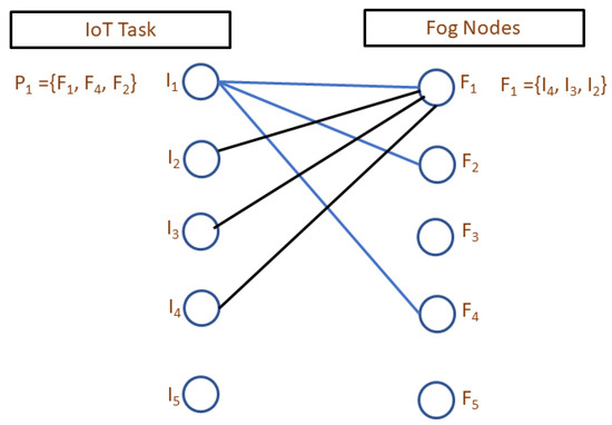 A bi-partite graph is developed between the fog nodes and IoT tasks as shown in Figure 2. On the left side of the graph, it shows the IoT tasks and on the right side of the graph, fog nodes are presented. Each IoT node and fog node has a preference set for each other. An edge exists between an IoT node and a fog node if both exist in the preference set of each other. The weight of the edge depends on the preference formulation.
