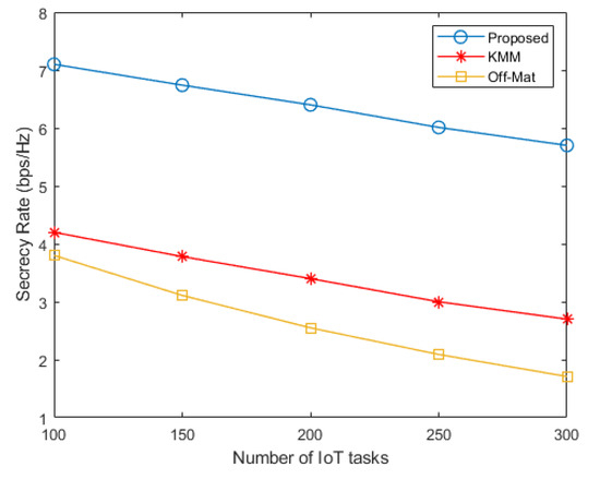 The secrecy rate of all techniques is shown in Figure 4. It can be seen that the proposed technique has a 2.8–5 bps/Hz higher secrecy rate in comparison to the KMM and Off-Mat techniques. The higher secrecy rate of the proposed technique is due to considering security as part of the preference profiles and using it for secure task offloading.