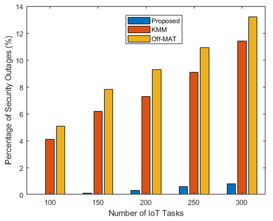 In Figure 5, the percentage of security outages is shown. This parameter is very critical as it is an indicator of tasks that eavesdroppers can intercept. It can be seen that the proposed technique shows very few security outages as compared to the other techniques. This is due to the consideration of the secrecy rate while developing the task offloading algorithm. For the KMM and the Off-Mat algorithm, the percentage of security outages goes up to 10–12% when the number of tasks is 300. At this point, the proposed technique only has security outages of less than 1%.