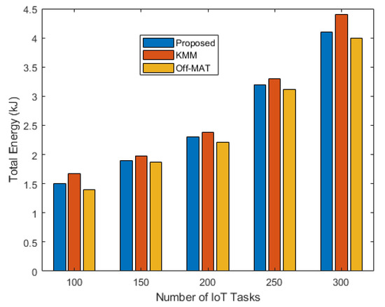 The graph in Figure 7 shows the energy consumed when using the proposed technique for the different numbers of IoT tasks. Since the proposed technique has a higher resource utilization, it experiences slightly higher energy consumption too. Of all the techniques, Off-Mat has lower energy consumption due to the lowest resource utilization. On the other hand, KMM has slightly higher energy consumption as it is designed for vehicular networks and does not select fog nodes based on energy criteria.