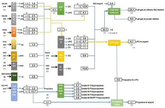 Thirteen refinery process units are involved in the production process of fuel gas, LPG, propylene, and polypropylene. The amount of these vapour phase and liquid phase hydrocarbon gaseous products extracted from the crude oil in the process of atmospheric distillation and generated in the process units—the reformer, hydrotreating units, FCC, and H-Oil—as a result of chemical reactions, depends on the crude oil origin and on the operating conditions in the mentioned refinery units. For the case shown in Figure 1, the fuel gas production amounts to 3.8% of the crude oil quantity and more than half of this comes from the fluid catalytic cracking (51.8%). Another important contributor to fuel gas production is H-Oil ebullated bed vacuum residue hydrocracking. Thus, the production of fuel gas is strongly dependent on the severity of the operation conditions applied in both of the heavy oil conversion processes, FCC and H-Oil. The main contributor to LPG production, as evident from the data in Figure 1, is crude oil distillation. It provides 75% of the feed for the central Gas Fractionation Unit (CGFU), where the extraction of the propane and n-butane is carried out; their mixing forms the refined product, LPG. As apparent from the data in Figure 1, LPG production is about four times as low as that of the production of fuel gas. The data in Figure 1 indicates that, in the case that the amount of fuel gas is insufficient to meet the refinery energy needs, an option exists in importing natural gas to replenish the fuel gas availability. Depending on the market requirements, liquid propylene can be exported as a chemical grade for polymerization propylene, or as a component of the LPG product. Typically, six grades of polypropylene products are produced and exported from the polypropylene unit.
