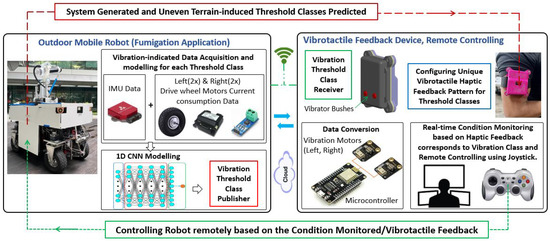 In this context, shared autonomy, where the robot’s autonomous system and operator input work collaboratively to make decisions and achieve common goals [9,10], is a safe and feasible option for outdoor robot deployment. Also, studies on haptic-feedback-based motion control of robots [11,12,13,14] have enabled effective remote operation. An environment-independent sensor selection for data acquisition and a fast and accurate classifier model is crucial for real-time CM frameworks for the outdoor environment. There are numerous AI-enabled and vibration-based terrainability studies for outdoor robots using different sensors to classify tile, stone, sand, asphalt, grass, and gravel [15,16,17,18,19], which will help to decide the traversability of the robot, but there is not a proper CM approach for assessing the health condition of the robot and level of terrain-induced concerns that accelerate system degradation. Hence, an automated CM and feasible remote controlling framework involving a shared autonomy and haptic feedback system is imperative for outdoor robots assisting in either stopping or minimising the exposure to extreme terrain conditions based on the internal health and external terrain states of the robot. Towards this effort, this paper proposes and discusses vibration-based anomalies prediction using Inertial Measurement Unit (IMU) and current sensors data and a 1D Convolutional Neural Network (1D CNN) as the classifier, along with real-time robot control, by developing a wearable vibrotactile haptic feedback system, assuring productivity and operational safety in outdoor mobile robots.