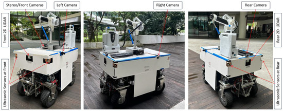 A shared autonomy framework is executed; hence, the robot’s autonomous behaviour is combined with human input as needed to monitor and control the robot, assuring the robot’s health and operational safety. The onboard computer processes a low-level autonomy stack using the perception sensors integrated to avoid large obstacles. The sensors include four ultrasonic sensors (UCC4000) mounted at four corners of the robot and two 2D LiDARs (SICK TIM581) mounted at the front and rear sides. A stereo camera (ZED 2) is mounted at the front towards the heading direction. For live streaming, four cameras are mounted: one main camera facing towards the heading direction, one at the rear side for any reverse motion, and the other two cameras at the left and right sides. This shared autonomy framework integrated into this fumigation robot was based on the previous works from our research lab [10], and a briefing of this shared autonomy framework is as follows. The four ultrasonic sensors detect obstacles, including transparent glass walls (when the robot traverses nearby buildings) and moving objects at all sides. The two 2D LiDAR sensors enable the robot to mainly detect any prominent cliffs, kerbs, or steps. The stereo camera detects the presence of pedestrians, bicycles, animals, and vehicles at the front, and measures pedestrian density as well. The four cameras help with live streaming. Additionally, a decision-making process based on multi-layer fuzzy logic is integrated into the robot as additional safety layers, considering the operator’s attention level and switching the operation modes, accordingly avoiding hazardous events. However, this is applicable only for the large obstacles in the heading direction of the robot, and any unseen and undetected ground-level obstacles are still harmful to the robot’s health and operational safety. The fumigation outdoor robot, as explained, used as a test platform in this study, is shown in Figure 2, including the perception sensors integrated for shared autonomy. Depending on the remote location, the human–robot interface/shared autonomy layer is connected through a network protocol, either using a local area network or cloud computing.