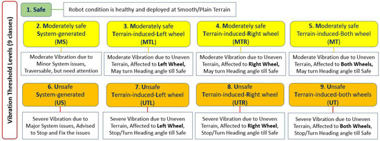 A mobile robot produces unusual vibrations as early symptoms of failure and potential hazards. The sources of such vibrations could be due to internal system issues like component deterioration, wear and tear, loose assembly, and an unbalanced structure, or external factors like uneven terrain and undetected ground-level small obstacles/features. Here, the severity of vibration depends on the various levels of such internal and external factors. Hence, a vibration threshold level-based classification used to distinguish the vibration sources and their acceptance assessment is essential to trigger prompt and proper corrective or maintenance action. For example, if the robot’s vibration is moderate, close attention is needed to proceed or change the heading direction. Suppose that the vibrations are severe due to internal or external factors: the operator should stop and fix the issues as soon as possible or change the heading direction to avoid ground-level obstacles and hazards. Hence, this study proposes nine vibration threshold classes for condition monitoring suitable for a four-wheeled outdoor mobile robot by considering both system-generated vibrations due to internal concerns and terrain-flaws-related external circumstances, namely Safe (no action required), Moderately safe due to System-generated (MS), Moderately safe due to Terrain-induced Left wheels affected (MTL), Moderately safe due to Terrain-induced Right wheels affected (MTR), Moderately safe due to Terrain-induced where both Left and Right wheels are affected (MT), Unsafe due to System-generated (US), Unsafe due to Terrain-induced Left wheels affected (UTL), Unsafe due to Terrain-induced Right wheels affected (UTR), and Unsafe due to Terrain-induced where both Left and Right wheels are affected (UT). Here, the MS class need to be kept in view to ensure that the condition is not worsening. The MTL, MTR, and MT classes need attention while proceeding or the heading direction may change. For the US class, the robot should be stopped and the issues should be fixed with proper maintenance actions. For the UTL, UTR, and UT classes, it is better to stop and change the heading angle and proceed only if it is safe. These nine vibration threshold classes tested and validated for condition monitoring in outdoor robots are depicted in Figure 3.