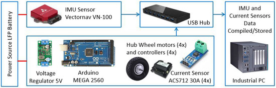 A wheeled outdoor mobile robot vibrates at different rates linearly or in angular motion (roll, pitch, yaw) due to being system-generated or terrain-induced, as explained in the previous section. Such abnormal movements of the robot could be assessed through IMU sensor data. Sometimes, the robot may not show an apparent vibration/angular motion when stuck with ground-level obstacles; instead, it keeps trying to overcome the obstacle, resulting in a higher torque required and higher current consumption. Hence, adding the current consumed data from each wheel motor will enhance the terrain-related threshold classes assessment specific to the left or right side affected for corrective action. Thus, these heterogeneous IMU and current sensors data support filling the gaps of individual sensors in extracting the relevant vibration-affected features. In this study, we used the onboard Vectornav VN-100 IMU sensor to extract the rate of the linear and angular motion of the robot at different vibration threshold classes, i.e., linear acceleration and angular velocity, from the accelerometer and gyroscope integrated with IMU. An ACS712 current sensor module is integrated with each wheel drive motor to tap the current consumption using an Arduino Mega 2560 microcontroller, enabling better prediction accuracy for terrain-induced classes specific to left and right. The calculated angular acceleration from the angular velocity data is added for further dataset strengthening. These proprioceptive sensors do not depend on each other and are unaffected by the environment or light conditions, facilitating higher-accuracy prediction. As the robot locomotion is controlled by four independent steering wheels (two drive wheels at both the front and rear) with holonomic mobility, the average current value of the front-left wheel motor and rear-left wheel motor is recorded as the left current value, and similarly for the Right. The IMU current sensors data acquisition scheme is depicted in Figure 4.