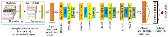 As the data features are in different scales, especially the current sensors values, normalisation pre-processing is conducted for the standard scale, supporting faster convergence during the 1D CNN training. Here, IMU data were normalised into −1 to +1 and 0 to 1 for current consumption data following Equations (5) and (6), respectively.