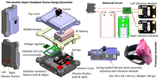 A vibrotactile haptic feedback device is developed to understand the anomalous cases related to the robot’s system/deterioration level and uneven terrain features causing accelerated degradation or hazards, thereby switching the robot’s control to operator mode and taking necessary actions in real-time. Here, the anomalous cases are the eight abnormal threshold classes (MS, MTL, MTR, MT, US, UTL, UTR, and UT) identified and predicted by the robot (publisher). The haptic device comprises an ESP8266 ESP-12E microcontroller, two vibration modules/motors (DFR0440), a 9 V alkaline battery, a 5 V voltage regulator, and a power switch. A 3D-printed middle bracket for holding/guiding the components and top and bottom protective enclosures are used and fastened with screws. The DFR0440 vibration module is built with an Eccentric Rotating Mass (ERM) vibration motor; hence, the module vibrates when the motor shaft with offset mass rotates. The vibration modules are vertically guided independently and floated with low-tension compression springs. A hemispherical plastic bush is attached to each vibration module, acting as an actuator for tactile stimulation. The two vibration modules and the vibrator bushes named left and right also represent the robot’s left and right wheels in the cases of left- and right-wheel-induced vibration classes. The vibration modules stimulate based on the vibration pattern configured for each threshold class and effectively deliver tactile feedback to the operator through the left and right vibrator bushes. As it is a wearable device, various ergonomics and safety factors have been considered while designing the device; for instance, a compact and minimum overall size while at the same time keeping the left and right bushes as far as possible to distinct the two bushes’ feedback, a lower weight, being easy to wear with a single hand, being adjustable to fit with the operator’s upper arm size, and having no sharp corners, especially regarding the vibrator bushes, which are in contact with the operator, for mechanical safety. In addition, the electrical circuits and battery connection are carefully wired and isolated for electrical safety. The device is compact, with a size of 80 × 68 × 38 mm, and weighs 100 gm. A single armband with a velcro fastener is used to firmly hold the device with the remote operator’s upper arm, and the spring-loaded left and right vibrator bushes ensure contact with the operator. The design and assembly details of the haptic feedback device proposed for the CM application of an outdoor mobile robot are depicted in Figure 6.