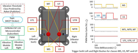 The vibration threshold classes predicted by the 1D CNN model at the robot side are published to a topic via MQTT Broker, which is subscribed by the microcontroller at the haptic feedback device. The vibrotactile feedback pattern for each threshold class should be easy to perceive and intuitive to avoid additional cognitive attempts from the operator. Hence, distinctive vibration feedback patterns are planned that correspond to each threshold class by changing the vibration intensity of the module (ERM speed), setting to ON/OFF and continuous ON modes, and utilising the left and right vibration modules/bushes. The vibration intensities of the module are set by changing the duty cycle of the Pulse Width Modulation (PWM) signal sent to the vibration module. The left, right, or both vibration modules will be stimulated for the terrain-induced classes specific to the affected left-, right-, or both-side wheels. For all Moderately safe classes (MS, MTL, MTR, and MT), the PWM duty cycle is set as 50% and, for all Unsafe classes (US, UTL, UTR, and UT), it is set to 100%, resulting in moderate and the highest vibration intensity, respectively. Further, to distinguish between system-generated and terrain-induced, the vibration pattern is set as ON and OFF mode for System-generated classes (MS and US) with an off time of 300 ms. And, for Terrain-induced classes (MTL, MTR, MT, UTL, UTR, and UT), the vibration mode is set as a continuous pattern. The predicted vibration threshold classes’ conversion to specific vibrotactile feedback patterns is illustrated in Figure 7. Here, 1.6 s is used for the vibration pattern, considering each prediction based on every new dataset.
