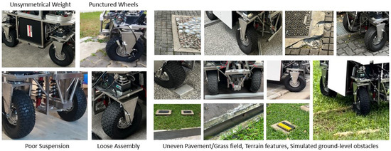 The data acquisition representing the nine classes for training the 1D CNN model, using the two heterogeneous sensors integrated with the fumigation robot, is critical. Hence, it is firstly confirmed that the Vectonav VN-100 IMU sensor and the four ACS712 30 A current sensors are mounted firmly with the chassis and wheel motors, and the data subscription rate (80 Hz) and dataset collection algorithm work properly, compiling the data in an array of [n × 128 × 11] as explained in Section 2.1.3. The robot’s linear speed is set at 0.3 m/s, which is the same as the operating speed, and the robot is driven in a zig-zag pattern while collecting the training data. For the safe class dataset preparation, the robot is tested, assuring good health, and is operated on plain and well-maintained pavements and grass fields, where no apparent vibrations are observed. The dataset collected during this trial is saved and labelled as the safe class. The data collection for the abnormal threshold classes involves robot modification representing system-generated classes and running through uneven and simulated ground-level obstacle environments, including positive and negative obstacles/features and unstructured grass fields. Some of these setups used to capture the internal system-generated classes (health issues) and external uneven/undetected ground-level obstacles/features for terrain-induce classes data collection are shown in Figure 8.