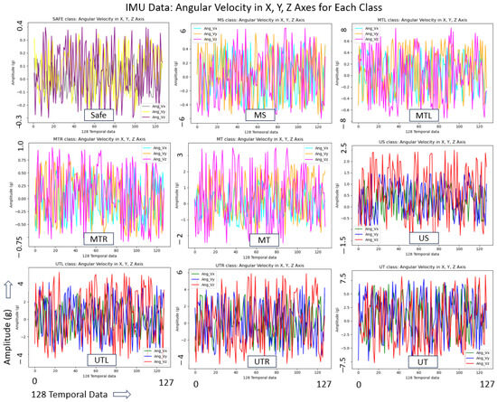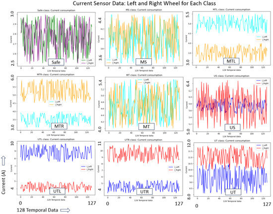 For all Unsafe classes (US, UTL, UTR, and UT), as the robot vibrates more severely, the deterioration rate become faster, and chances of total failure and hazards are high. Hence, during such trials, the robot stopped intermittently and adjusted to continue trials as an unsafe class. Also, all safety measures like close observation and an emergency stop button were taken if needed. For each threshold class, a total of 2500 samples, forming an array of [2500 × 128 × 11], were saved and split into 80% and 20% for training and validation, respectively, for training the 1D CNN model. Additionally, a total of 500 dataset samples were recorded for each class to evaluate the accuracy of the trained model. The vibration-indicated IMU and current sensors data across the nine classes found different values/patterns, enabling a faster convergence in extracting the unique characteristics of each class and a higher prediction accuracy. For a visual representation of this unique dataset for each class, we randomly collected a single dataset of 128 elements and used only five features here for plotting, i.e., features from IMU (angular velocity in X, Y, and Z axes) and the current sensor (left and right wheel current consumption) as shown in Figure 9 and Figure 10.