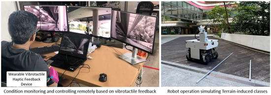 The vibrotactile haptic feedback approach is used in many systems, conveying information to the user or operator through vibration patterns, mainly for human health monitoring or assistance, by developing wearable devices, such as the health monitoring of an offshore operator in [36] and wheelchair navigation for disability people in [37]. Recently, these techniques have been applied to remotely controlled industrial and mobile robots. For instance, haptic-feedback-based teleoperation using a Phantom Omni haptic feedback master device and a 6-DOF robot arm was used with a force sensor as a slave, enabling the operator to adjust the position and direction of the arm safely from a distance based on the distance from the haptic feedback to the manipulator [38], and a similar study was conducted in [39] to stop the manipulator avoiding any collision. An inexpensive electro-tactile-based haptic feedback method is presented in [40] for obstacle avoidance in a cluttered workspace of a teleoperated robot arm. A wearable hand gesture recognition and vibrotactile system is developed in [41] to control drone navigation, where the obstacle information in the heading direction is fed back to the operator. A haptic feedback and shared autonomy-based teleoperation for the safe navigation of mobile robots is explained in [11], where obstacle range information is fed back to the operator as a force through a haptic probe. Similar force feedback studies for mobile robots were conducted, including [12,13,14]. These haptic-feedback-based works are mainly undertaken for indoor robots for smooth navigation and avoiding obstacles in the heading direction. However, to our knowledge, there are no such works for CM applications in outdoor robots, feeding back the system deterioration stage and terrain-related features to ensure the robot’s health and operational safety.