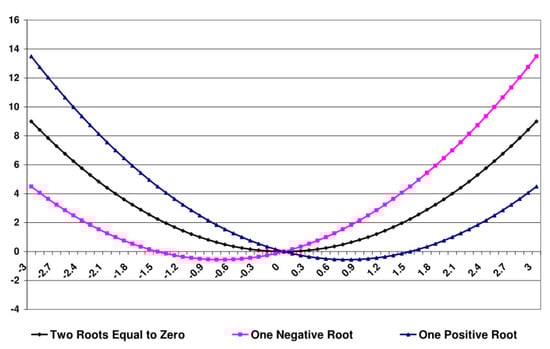 With this, we can see that (6) is a strictly convex quadratic form with, at most, two different real roots. One of them is zero, which rules out the possibility of two complex roots. The other real root is