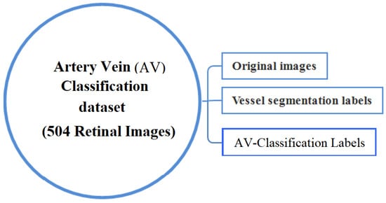 The authors used the AV classification dataset from [32]. The dataset is ideally suited for solving the challenges of vascular segmentation and AV classification, two forms of retinal image processing using deep learning algorithms (see Figure 1). The 504 original colored images of fifty middle-aged participants were scanned using non-mydriatic fundus cameras (Topcon) at a resolution of 2002 × 2000 pixels to build the dataset, which was then labeled with two different types of ground truth information. The right and left eye images were both collected. There are limited publicly available datasets for experimenting with retinal image processing. These datasets, such as the DRIVE dataset (20 images), the STARE dataset (60 images), and the CHASEDB dataset (28 images), are very small. To address this issue, the AV classification dataset has been introduced. All 504 retinal images were used to calculate tortuosity metrics values for each vessel segment in the AV classification dataset images. Across 504 images, there were a total of 64,244 segments. The dataset is vast and can be utilized to assess any morphological transformations in a retinal image or observe other phenomena in the retinal vasculature.
