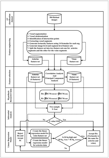 In order to support the research claim, the approach in this study used statistical inferential analysis to calculate the tortuosity using 14 tortuosity measures and to create two feature sets, one for arteries and the other for veins. The specific methods are shown in Figure 2.