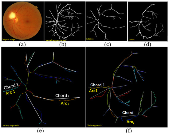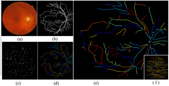 Snapshot of the retinal image at each step: (a) the colored retina; (b) the segmented vessels; (c) cross-section/branching points removal; (d) the vasculature tree skeleton; (e) vessel fragments; (f) calculation of vessel tortuosity.