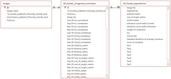 Entity relationship diagram for the generated features. It displays three prepared feature sets, which can be viewed as three Excel sheets or tables. The first table contains the names of all 504 retinal images, while the second table provides image-wise statistical summaries (Min, Max, Average, sum) of each tortuosity metric for each image (with 504 rows in total), which comprises 76 columns. The third table contains segment-wise statistical details. To view a sample of the segment-wise table data, please see the results section. These three tables are filled separately for arteries and veins, with the same Tortuosity metrics calculations are applied to both.