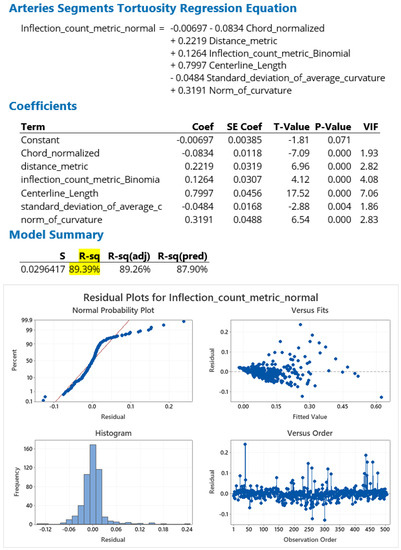 Regression analyses and two sample T-tests were carried out to study further the effect of the ‘vessel type’ on the results of quantifying the tortuosity metrics. It was found that the ‘vessel type’ has no significant effect on the tortuosity calculation, as, when applied to the two-sample T-test on the veins and arteries feature sets, the p-value > 0.05 proved that the null hypothesis in (16) is correct and indicates that the mean of the tortuosity of arteries and the veins are the same. In contrast, the R-Sq values reported in the linear regression analysis for arteries and veins were 89.39% and 89.11%, respectively. This indicates that the linear regression formulas for both arteries and veins represent 89% of the data under study, which are equivalent and strong in both formulas. Hence, the measurement of tortuosity geometric phenomena using ICM is the same for arteries and veins.