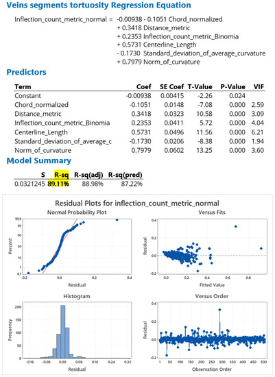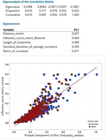 Through PCA and correlation analysis, dimensionality reduction was achieved, which helped identify the six highest correlated tortuosity metrics out of the total of fourteen. These metrics were then used in the following analysis steps. The regression analysis was performed on each feature set to find the tortuosity formula of each feature set and to compare the R-Sq values. Likewise, the two-sample T-test was performed on the two feature sets. The first sample contained the ‘Inflection count metric normal’ values for arteries records, and the second contained the ’Inflection count metric normal’ for veins records.