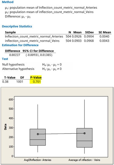 We are checking that there is no significant difference in the means of the arteries and veins datasets. In a Two-sample T-test, the null hypothesis is always the claim that the means are equivalent, while the alternative hypothesis claims otherwise. This way, the null hypothesis is accepted if the p-value is greater than the critical value (0.05); otherwise, the null hypothesis is rejected [37].