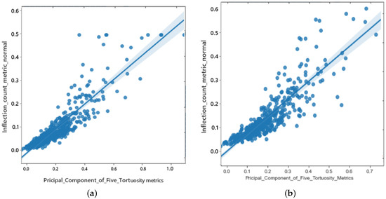 The principal component analysis machine learning method was used to identify that ‘inflection count metric normal’ is the most strongly correlated with each component/tortuosity metric to finalize the feature selection and the visualization of the linear regression formulas in the 2-dimensional space.