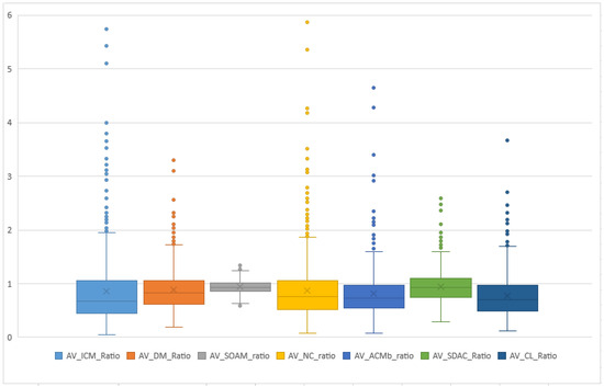 Box plots of the generated AV tortuosity metrics ratios of the arteries mean over the veins mean for each image across the AV classification dataset. The AV tortuosity ratios are generated for the metrics ICM, DM, SOAM, NC, ICMb, SDAC, and CL.