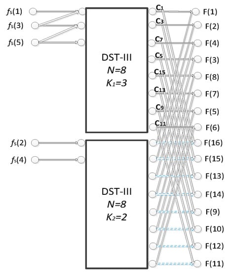 Suppose that , , and in is fixed; then, Equation (26) is a pruned DST of type I (DST-I). If has a power of 2, then the decimation-in-time algorithm [24] recursively splits the input DST-I into two half-length DST-I transforms with even and odd indices, as follows: