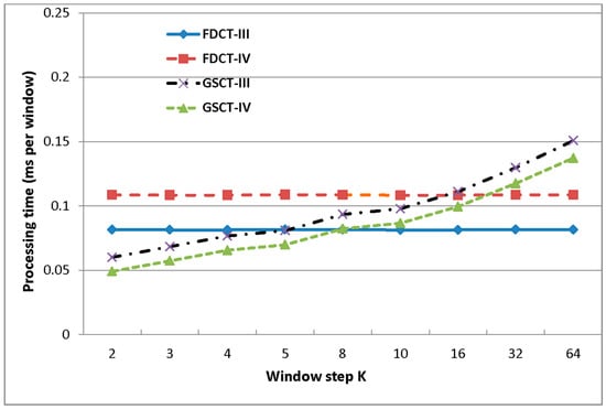 When the signal spectrum changes slowly, the window can move more than one sample at a time to speed up the spectral analysis. To quickly calculate the DCT in a window moving with small integer steps, a recursive sliding algorithm was proposed [21]. Recursive equations and fast algorithms have been proposed for calculating various types of generalized sliding DCTs [22] that can be turned as a trade-off between hardware consumption and performance.