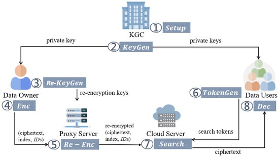 - Proxy Server (PS): PS is fully trusted and responsible for re-encryption. After receiving the re-encryption keys, ciphertext, index, and s from DO, PS re-encrypts the ciphertext and index. Finally, PS sends the re-encrypted results to CS.