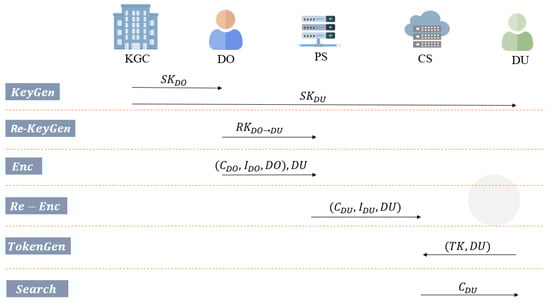 - Data Owner (DO): DO can pre-generate re-encryption keys and send them to PS before the encryption phase. Then, in the encryption phase, DO computes the ciphertext, index, and s (a set of DUs’ identities). Then, DO sends (ciphertext, index, s) to PS.