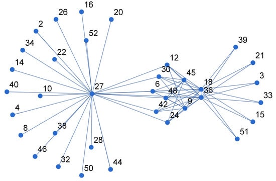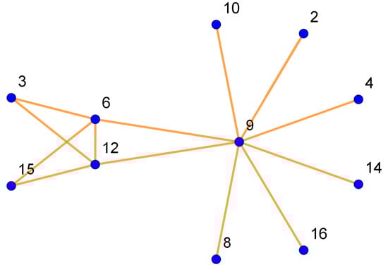 A graph that depends on algebraic structures such as group theory, number theory, and ring theory is known as an algebraic graph. In the field of algebraic graph theory, various problems are still open; the number of components problem of a graph, which depends on the modular relation, still remains a conjuncture. There are several algebraic graphs based on the algebraic structure that has been studied, but here we are going to discuss a zero-divisor graph that depends on the set of zero divisors of a ring R. A graph is known as a zero-divisor graph whose vertex set is the zero divisors of the modular ring , and two vertices will be adjacent to each other if their product will be zero under (mod n) [34]. The zero-divisor graph for is shown in Figure 1. For further understanding related to algebraic structure graphs and their properties, reader should can study [35,36,37,38,39,40].