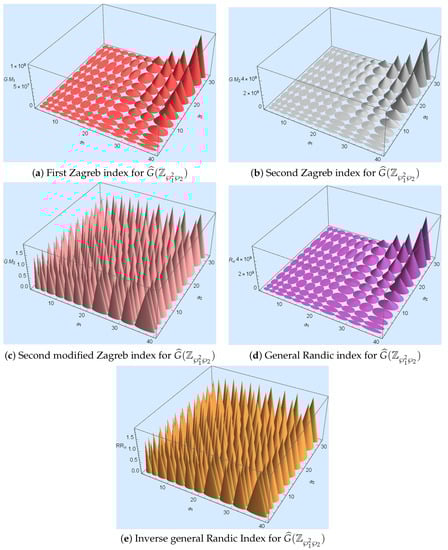 The three-dimensional discrete plot of first Zagreb, second Zagreb, second modified Zagreb, general Randic, and Inverse general Randic index for .