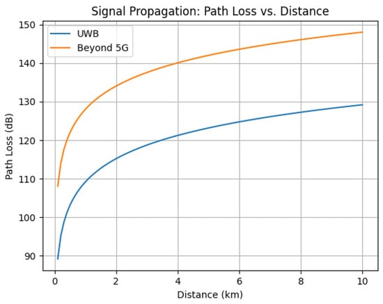 This section presents a comparative study of the performance of UWB and a specific Beyond 5G technology, focusing on key performance indicators such as latency, data rate, path loss, and distance. To provide a relevant comparison, we consider terahertz (THz) communication [