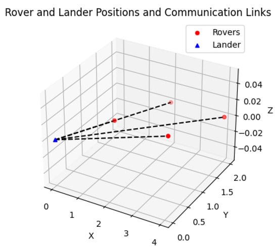 Figure 4, we show a conceptual plot of a lander acting as an anchor and communicating with several rovers that are exploring the terrain.