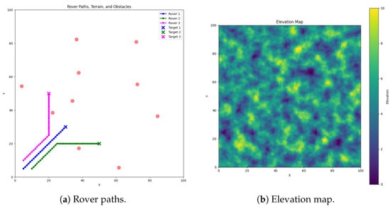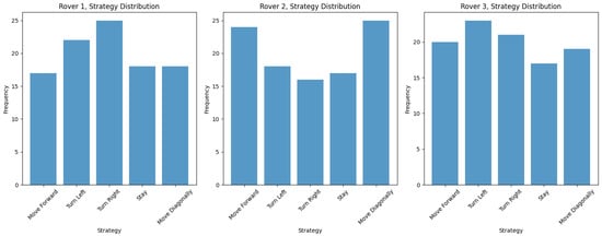 Each rover was implemented as an object possessing attributes for both position and current strategy. Random values were used to approximate real-world metrics such as time efficiency, obstacle avoidance, and communication strength for the purpose of this simplified simulation. The simulation utilized dynamic weights , , and to model changing priorities in real-world scenarios. For instance, as a rover approaches an obstacle, it might dynamically adjust the weights to favor obstacle avoidance over time efficiency.