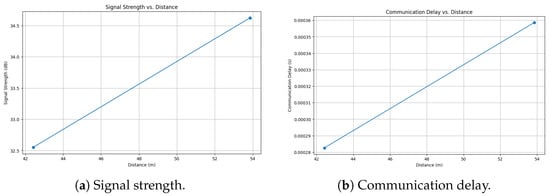Figure 6b reveal that the communication delay increases linearly with the distance between the rover and the lunar lander. This is attributable to the increased time-of-flight of signals as the distance expands. Additionally, the lunar terrain, characterized by craters and rocky formations, may introduce additional delays due to the diffraction and reflection of signals.