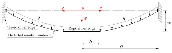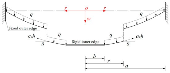 A free body with radius r (b ≤ r ≤ a) is assumed to be taken out from the central region of the deflected annular membrane under the transverse loads q, to study its static problem of equilibrium under the joint action of the vertical (transverse) force π(r2 − b2)q produced by the loads q and the vertical force 2πrσrhsinθ produced by the membrane force σrh that is acting on the boundary r, as shown in Figure 2, where σr denotes the radial stress and θ denotes the slope angle of the deflected annular membrane. When the free body is in equilibrium, the resultant force in the vertical direction should be equal to zero, that is,