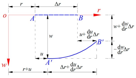 Suppose that the radial and transverse displacements of the point A are denoted by u(r) and w(r), respectively. Then, the radial and transverse displacements of the point B may be denoted by u(r + Δr) and w(r + Δr), respectively. The u(r + Δr) and w(r + Δr) can be expanded into a Taylor series, and after ignoring the infinitely small higher order terms in Taylor expansion, they can be approximately expressed as the following forms