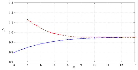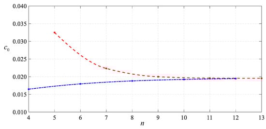 Variation in c0 with n when q = 0.15 MPa, where the dashed line corresponds to the case where n is odd and the dash-dot line corresponds to the case where n is even.