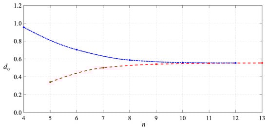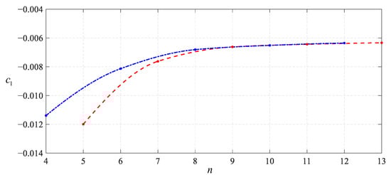 Then, assign values to the parameter n in Equations (43)–(45). Start with a small n value, say, n = 4. After eliminating ci (i = 2, 3, 4) and di (i = 1, 2, 3, 4) in Equations (43)–(45) by using the recurrence formulas in Appendix A, only the undetermined constants c0 and c1 are left in Equations (43) and (44), while Equation (45) also contains only the undetermined constants c0 and c1 in addition to the undetermined constant d0. Therefore, when n = 4, the values of the undetermined constants c0 and c1 can be determined by simultaneously solving Equations (43) and (44), and with the known c0 and c1, the value of the undetermined constant d0 can easily be determined by Equation (45). Next, continue the calculation of numerical values of c0, c1, and d0 with n = 5, and then with n = 6, …, until the calculated numerical values of c0, c1, and d0 are sufficiently saturated, as shown in Table 1 and Table 2. By the way, the calculation of numerical values of c0, c1 and d0 is usually not easy due to the complex recursion formulas for the power series coefficients in Appendix A. Obviously, the greater the value of the parameter n in Equations (43)–(45), the greater the difficulty of the numerical calculations, that is, the greater the time consumption of labor and computer.