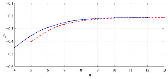Variation in c1 with n when q = 0.0008 MPa, where the dashed line corresponds to the case where n is odd and the dash-dot line corresponds to the case where n is even.