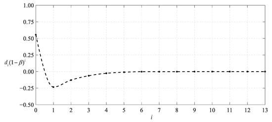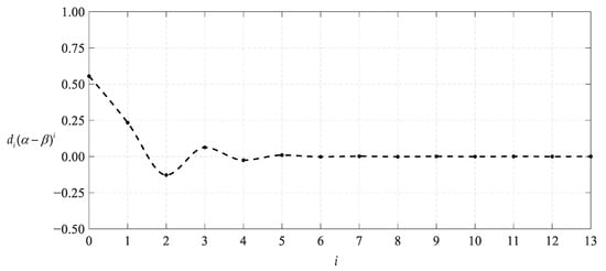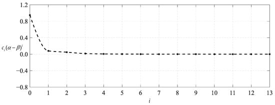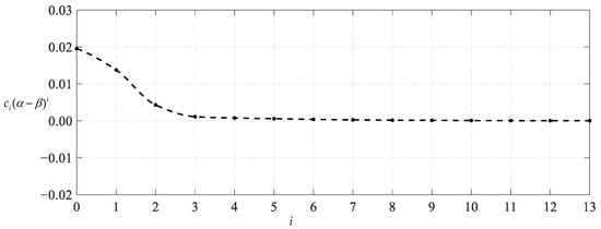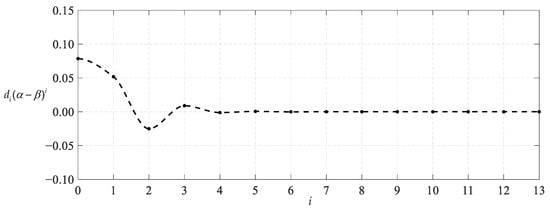 Table 3 and Table 4 (for q = 0.0008 Mpa) and Table 5 and Table 6 (for q = 0.15 Mpa) show the calculated numerical values of the ci(1 − β)I, ci(α − β)i, and di(1 − β)i, di(α − β)i in the expressions of stress and deflection solutions when x = 1 and x = α (see Equations (26) and (27)). The variations in ci(1–β)I, ci(α − β)i, di(1 − β)i, and di(α − β)i with i are shown in Figure 10, Figure 11, Figure 12 and Figure 13 (for q = 0.0008 MPa) and Figure 14, Figure 15, Figure 16 and Figure 17 (for q = 0.15 MPa). It can be seen from Figure 10, Figure 11, Figure 12 and Figure 13 and Figure 14, Figure 15, Figure 16 and Figure 17 that the power series solutions of stress and deflection converge at the two endpoints of the closed interval [1/4,1] for both q = 0.0008 MPa and q = 0.15 MPa. This suggests that when the uniformly distributed transverse loads q is between 0.0008 MPa and 0.15 MPa, the power series solutions of stress and deflection are convergent and usable.