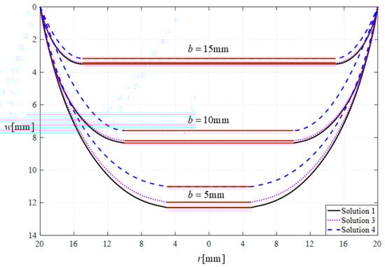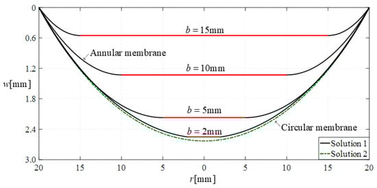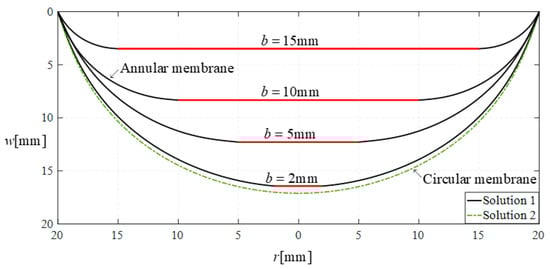 The reliability of the hollow annular membrane solution obtained in Section 2 can be verified in the following way. Obviously, the shape of an annular membrane with inner radius b and outer radius a can gradually approach the shape of a circular membrane with radius a as the inner radius b of the annular membrane gradually approaches zero, if the membrane thickness h, Poisson’s ratio v, Young’s modulus of elasticity E, and the uniformly distributed transverse loads q are the same. This can be used to check the reliability of the hollow annular membrane solution derived in Section 2. Figure 18 and Figure 19 show the asymptotic behavior when the uniformly distributed transverse loads q take 0.0008 MPa and 0.15 MPa: as the inner radius b of the hollow annular membrane with Young’s modulus of elasticity E = 7.84 MPa, Poisson’s ratio v = 0.47, thickness h = 0.2 mm, and outer radius a = 20 mm goes from 15 mm to 10 mm, then to 5 mm, and finally to 2 mm, its deflection curves gradually approach the deflection curve of the circular membrane with Young’s modulus of elasticity E = 7.84 MPa, Poisson’s ratio v = 0.47, thickness h = 0.2 mm and radius a = 20 mm. In Figure 18 and Figure 19, “Solution 1” refers to the annular membrane results calculated by using the hollow annular membrane solution derived in Section 2 in this paper. “Solution 2” refers to the circular membrane result calculated by using the circular membrane solution derived in [39]. Therefore, the fully asymptotic behaviors shown in Figure 18 and Figure 19 suggest that the hollow annular membrane solution derived in Section 2 is, to a certain extent, reliable.