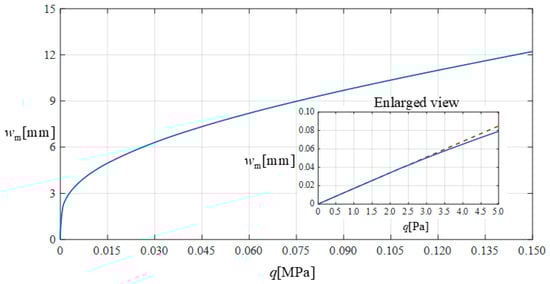 The usually so-called large deflection problems refer to the case where the maximum deflections of thin plates or membranes are greater than 1/5 of their thicknesses, and conversely, the case where the maximum deflections of thin plates or membranes are smaller than 1/5 of their thicknesses is usually called small deflection problems. The large deflection problems usually show effects of nonlinearity between loads and deflections while the small deflection problems usually show effects of linearity. Figure 20 shows the relationship between loads q and maximum deflections wm of the hollow annular membrane with E = 7.84 MPa, v = 0.47, a = 20 mm, b = 5 mm, and h = 0.2 mm. It can be seen from the enlarged view in Figure 20 that when wm < h/5 = 0.04 mm, the effect of linearity predominates, and when wm > h/5 = 0.04 mm, the effect of nonlinearity gradually predominates. In fact, such a effect from linear dominance to nonlinear dominance is not only true in thin-plate or membrane problems, but also in beam problems [40].