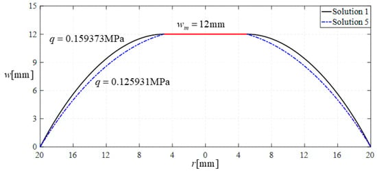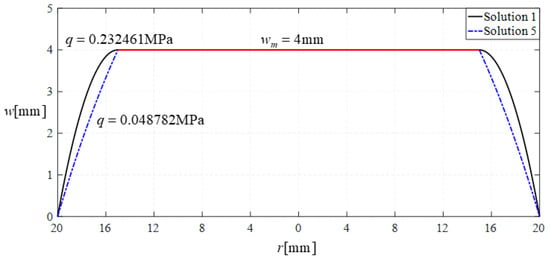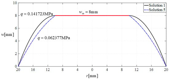 The cross sections along the diameter of the inverted hollow and solid (not-hollow) annular membranes with the same Young’s modulus of elasticity E = 7.84 MPa, Poisson’s ratio v = 0.47, thickness h = 0.2 mm, outer radius a = 20 mm, inner radius b = 15 mm, maximum deflection wm = 4 mm, but loaded by q = 0.232461 MPa (hollow) and q = 0.048782 MPa (not-hollow), respectively, where “Solution 1” refers to the results calculated by using the new hollow annular membrane solution derived in Section 2 in this paper, and “Solution 5” refers to the results calculated by using the solid (not-hollow) annular membrane solution derived in [41].