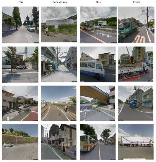 There are already open-source transport object datasets, such as KITTI [56] and Tsinghua–Daimler [53], helping move forward the development of multi-class transport object detection. Although a large-scale, street-view dataset that covers the great variability of transport objects is in high demand, there is no sophisticated GSV dataset of road users available yet, except for the Cityscapes object detection benchmark, as shown in Figure 1 [57]. Even in the Cityscape dataset, the amount of each class instance is limited [56]. For instance, the number of cyclist samples is less than 3000 in the training set, which is not sufficient for deep network learning. Therefore, a public dataset which contains a large quantity of multi-class samples is required to avoid underfitting and improve generalization of the associated network training. Furthermore, existing annotated datasets, such as CityScape, tend to involve images with a different ratio from the GSV Imagery and under different conditions (light–dense travel patterns in European cities), but are unsuitable for the interpretation of the complexity of street views [14]. Nevertheless, there are various Google Street View datasets publicly available, although few focus on transport objects or road users of GSV images [58].