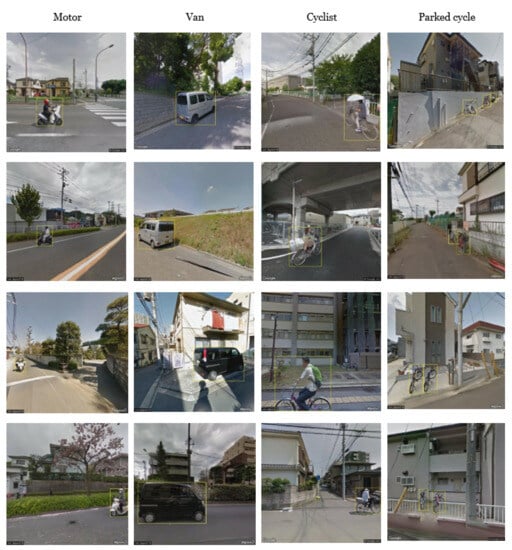 This dataset consists of a massive amount of images of eight defined classes of transport objects that vary widely in appearance, scale, occlusion and viewpoint. In particular, the target categories of road users include cars, pedestrians, buses, trucks, motor, vans, cyclists and parked cycles. This is implemented by reviewing the common transport modes that frequently appear in Tokyo. Single instances of road users are annotated individually. An excerpt of eight transport mode samples is illustrated in Figure 2. To reflect the complexity of this newly introduced dataset, the basic properties of TMS-Tokyo are listed in Table 1, together with those of other more established transport datasets, including the Tsinghua–Daimler Cyclist Benchmark [53], KITTI [56], Mapillary Vistas [60], BDD100K [61] and CityScapes [57]. Note that, whilst TMS-Tokyo is not the largest image dataset for object detection, it is the Google Street View dataset of the largest size which is specifically devised for transport object detection. Please refer to Appendix A and Appendix B for further details of the creation of the TMS-Tokyo Dataset.