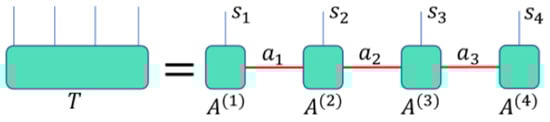 Figure 4 depicts a schema of the TT decomposition of a fourth-order tensor. The indices of the large tensor are denoted as , and each subsequent decomposition involves second- or third-order tensors with the first index corresponding to the original index of the large tensor. New auxiliary indices are introduced to facilitate the decomposition process. Consequently, the first sub-tensor resulting from the decomposition contains only one auxiliary index , while the second sub-tensor has two auxiliary indices and . This indicates that both ends of the decomposition are second-order tensors, while the intermediate tensor is a third-order tensor.