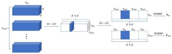 The process of obtaining the rank for a four-order tensor, i.e., the calculation process of EVBMF, is illustrated in Figure 5. For tensor-train decomposition, the maximum rank is selected from and , since only one rank is required as the tensor rank. Choosing the maximum rank ensures accuracy and recoverability. Note that opting for a rank lower than the maximum increases the likelihood of compressing one or more dimensions excessively, which may lead to precision loss or irrecoverable issues.